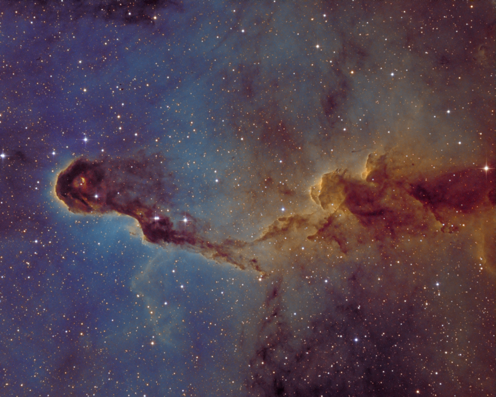 The elephant trunk nebula, also known under the catalog name IC 1396A, is a lightly glowing globule, a collection of interstellar gas and dust, in the constellation of Cepheus. The globule belongs to IC 1396, an H-II region with an embedded star cluster, and is about 2,400 light years away from Earth. The nebula is an active star formation area and contains a series of young stars and protostars that are between 100,000 and a million years old. In front of the globule is the reflection nebula van den Bergh 142 (vdB 142), which is very probably physically related. This reflection nebula is irradiated by the B3 star HD 239710.
