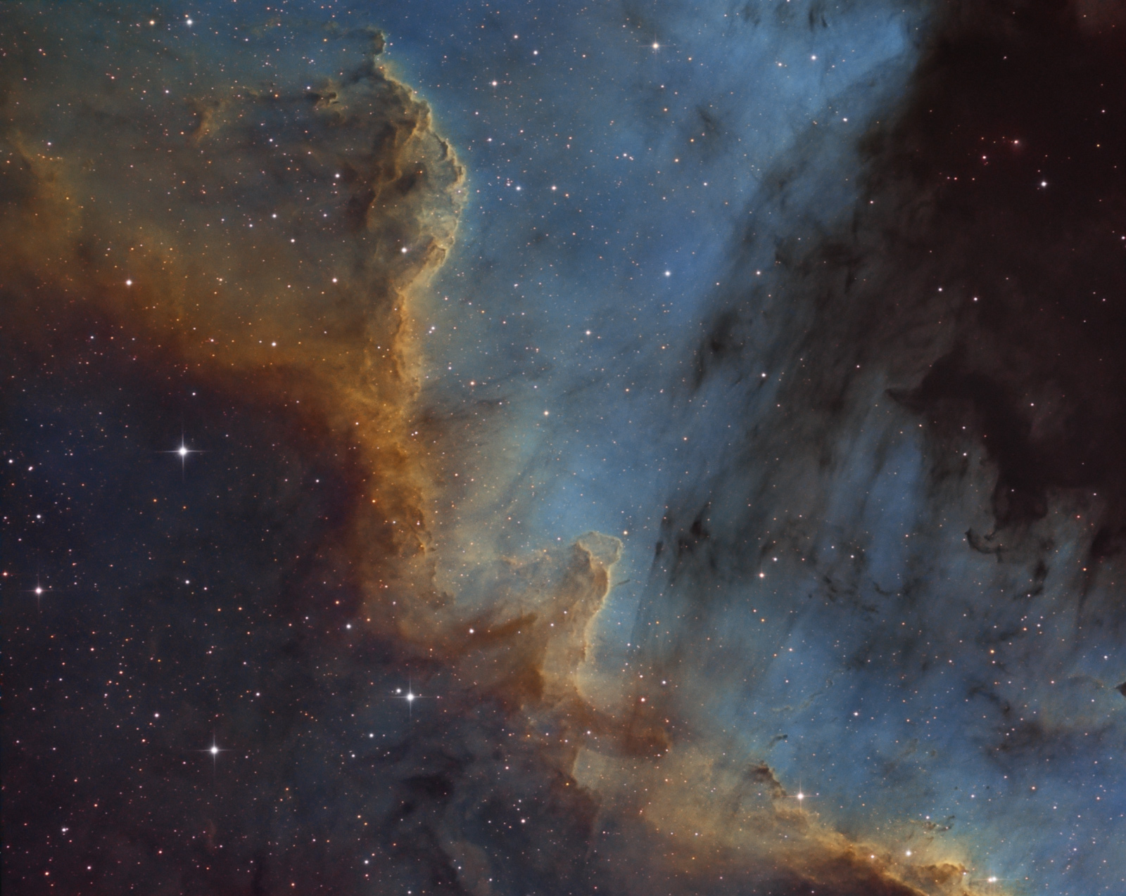 This false color image was captured in the gas spectrum of the ionized hydrogen (H-alpha), oxygen ([O III]) and sulfur ([S II]). An RGB image was created from the three channels. The red channel was assigned equally [S II], the green channel H-alpha and the blue channel [OIII]. In sum, this results in a very interesting color play, which reflects the structures very contrastively.
